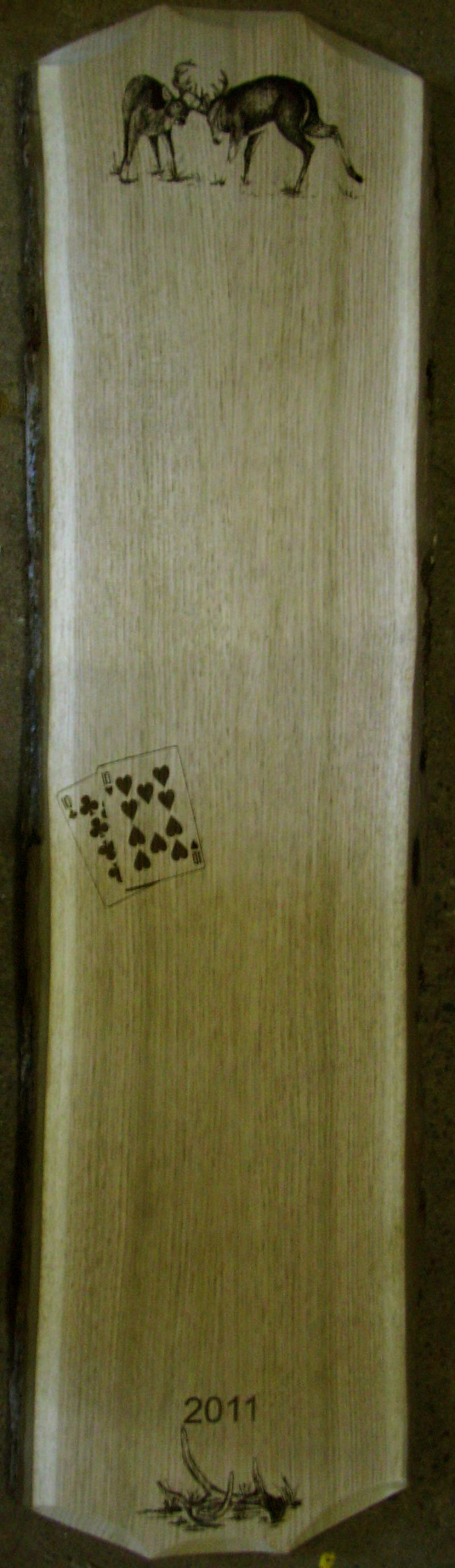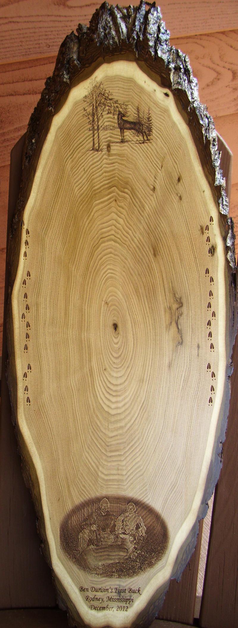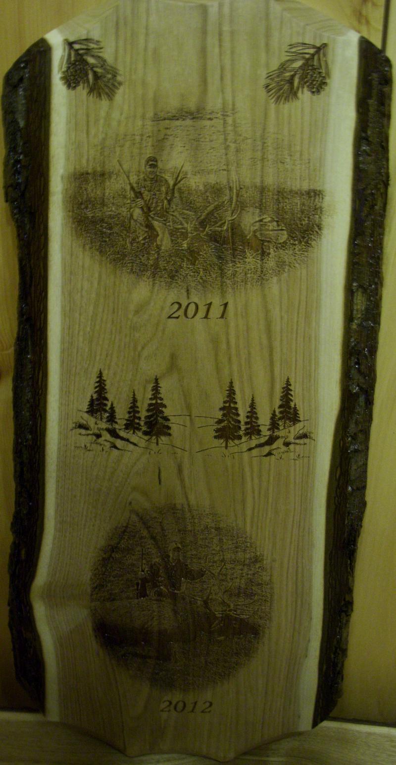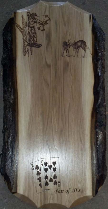 We wanted to create something "different"...a different option from the old fashioned "badge plaques" to mount your trophy animals, birds, and fish! We wanted to create a board keeping the bark on and then engraving the most true to life images we could find. We couldn't find any so we have a few artists hand draw them for us to use in our programs!